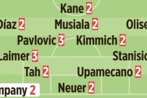 首发:凯恩2分/迪亚斯2分、穆西亚拉2分、奥利塞2分/帕夫洛维奇3分、基米希2分/莱默尔3分、若纳坦·塔2分、于帕梅卡诺2分、斯坦尼西奇3分/诺伊尔2分