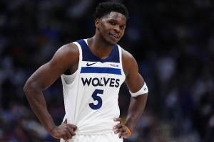 上半场,带伤出战的森林狼球星爱德华兹表现并不好,进攻端毫无手感,半场结束前更因为左膝受伤离场,打了17分半,投篮8中1,三分球3中1,罚球2中2,仅拿到5分3篮板,正负值-3。